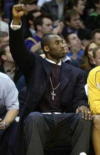 Los Angeles Lakers' Kobe Bryanat celebrates the Lakers' 92-79 victory over the Portland Trailblazers in Los Angeles, Tuesday, Feb. 1, 2005. [AP]
