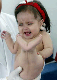 Nine-month-old Milagros Cerron rests at the hospital in Lima, February 1, 2005. The Peruvian baby dubbed the 'Little Mermaid' because she was born with a rare condition in which her legs are fused, will have surgery this month to try to separate them. [Reuters]