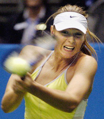 Wimbledon champion Maria Sharapova of Russia hits a shot during her match against Maria Vento-Kabchi of Venezuela during the second round of the Pan Pacific Open tennis tournament in Tokyo, February 2, 2005. Sharapova won the match 7-6 6-0. [Reuters]