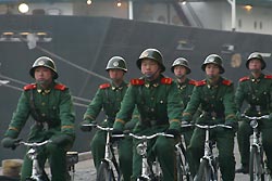 Armed police staff patrol at the port area of Qinghuangdao on January 31, 2005. [newsphoto]