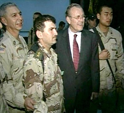 A video grab image shows U.S. Secretary of Defense Donald Rumsfeld (C) posing with U.S. Troops in Mosul, February 11, 2005. Rumsfeld arrived before dawn at an airfield outside the northern city of Mosul. It was his eighth visit to Iraq and came seven weeks after his Dec. 24 Christmas eve visit with U.S. Troops. [Reuters] |
