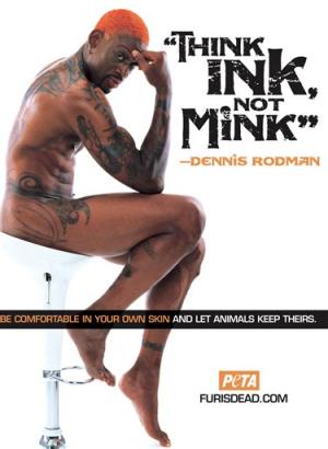 In this photo supplied by the People for the Ethical Treatment of Animals (PETA), tattoo-resplendent former NBA star Dennis Rodman appears completely nude in a celebrity anti-fur ad by PETA.The ad made its debut at New York Fashion Week. [AP]