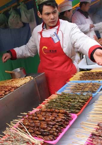 Odd delicacy: Pupas roasted on skewers are sold at the temple fair in Beijing's Temple of Earth Monday, Feb. 14, 2005. "Insects on skewers" have become popular snacks among tourists at the traditional temple fairs in Beijing during the Spring Festival holiday. [newsphoto]