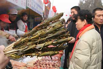 Locusts roasted on skewers are sold at the temple fair in Beijing's Temple of Earth Monday, Feb. 14, 2005. [newsphoto]