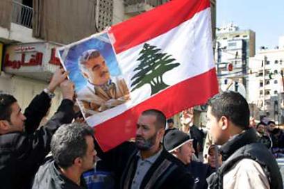 Lebanese supporters of former prime minister Rafik al-Hariri hold aloft a flag and Hariri's portrait in Beirut c February 15, 2005. Lebanon shut down on Tuesday to mourn former Hariri, whose death in a huge car bomb cast a harsh spotlight on troubled relations with Syria and revived memories of the 1975-90 civil war. [Reuters]