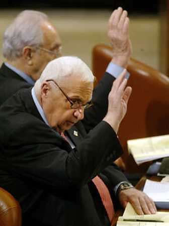 Israeli Prime Minister Ariel Sharon (R) and Vice Prime Minister Shimon Peres vote at the Israeli Knesset in Jerusalem February 16, 2005. [Reuters]