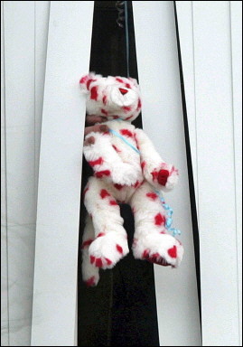 The showman sent a handful of diehard fans into a frenzy when he briefly appeared at his fourth floor hospital window, flashing his signature V-sign and waving a teddy bear his admirers say they had given him. An intravenous tube could be seen on his arm.