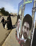 A woman and children walk past a sign in support of Shiite cleric and politician Abdel-Aziz al-Hakim in Karbala, Iraq Thursday, Feb. 17, 2005. [AP]