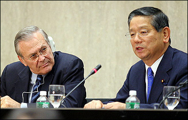 US Secretary of Defense Donald Rumsfeld (L) listens to Japanese Foreign Minister Nobutaka Machimura during a press conference at the State Department in Washington, DC. The US and Japan declared that Taiwan was a common security issue. [AFP]