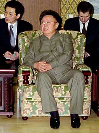 North Korean top leader Kim Jong-il (centre) meets with Mira Koltsova, head of the Russian state academy Beriozka dancing troupe, in Pyongyang February 17, 2005. North Korean leader Kim Jong-il has made his first appearance before the general public in two months. [Reuters]