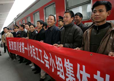 After receiving a warm welcome from trade union members in Ningbo, Zhejiang Province, migrant workers from Sichuan Province pose for a group photo. Trade unions are playing an increasingly important role in securing migrant workers' interests. [newsphoto]