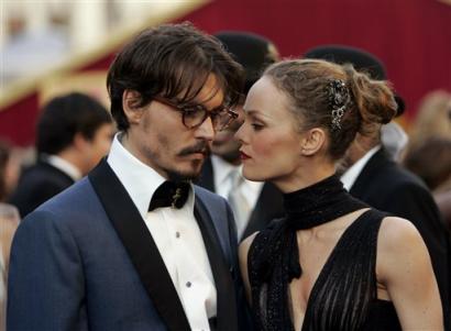 Johnny Depp shares a moment with his partner, French actress Vanessa Paradis, as they arrive atthe 77th Academy Awards Sunday, Feb. 27, 2005, in Los Angeles. Depp is nominated for an Oscar for best actor in a leading role for his work in 'Finding Neverland.' [AP]
