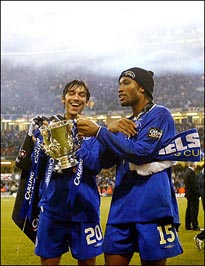The final, played beneath a closed roof, brought Chelsea's billionaire owner Roman Abramovich his first silverware since buying the then debt-ridden west London club in July 2003. The Russian has spent more than 200 million pounds on the squad and their six-point lead at the top of the league, with a game in hand over Manchester United, is a further testament to their success. Sunday's victory will also provide a valuable morale boost for Mourinho's men after their Champions League hopes were compromised in midweek by a 2-1 defeat at Barcelona in their knockout round first leg tie. They also had their FA Cup hopes ended last Sunday with a 1-0 defeat by Newcastle United. "We have the first title and almost for sure the second will be the big one," said Mourinho, referring to the Premier League. Regarding his gestures towards the Liverpool fans, Mourinho added: "I don't regret it, the only thing I have to understand is that I'm in England and have to adapt. The sign with my finger over the mouth was not for (the Liverpool fans) it was for the English press." Liverpool, who had been buoyed by their 3-1 Champions League win over Bayer Leverkusen, will consider themselves unlucky after withstanding relentless pressure for so long. None will have more regrets, though, than Gerrard, who has done more than any other player for the Liverpool cause in recent years and whose penalty area header flew past Dudek off the inside of the post. "Losing any game of football is painful but to lose a final and score an own goal, it is a bad day for myself," said Gerrard, who is linked with a move to Chelsea next season. "It is very hard but credit to Chelsea, they deserved to win. We scored early on, maybe a bit too early for our liking." DREAM START Liverpool got off to a dream start when Chelsea failed to close down Morientes, the man whose goals helped Monaco knock Chelsea out of last season's Champions League semi-finals. The Spaniard wriggled away from the Chelsea defenders on the right side, floated a high ball over to the left and the completely unmarked Riise thumped a volley past Petr Cech. Chelsea shrugged off the setback, but their first real shot in anger only came after 22 minutes when Frank Lampard was teed up for a shot from a free kick which flew straight into the waiting arms of Dudek. The Polish keeper then did enough to block a Drogba effort minutes later and Luis Garcia, who had been impressively leading the Liverpool attack from midfield, made a controlled clearance off the line as Chelsea continued to turn the screw. Mourinho, relishing his first season in English football, tried to remedy that at halftime, swapping disappointing Czech midfielder Jiri Jarosik for Icelandic striker Eidur Gudjohnsen. The switch soon paid dividends when Dudek, a villain for allowing Leverkusen to score a stoppage-time goal on Tuesday, pulled off a superb double-save to stop a Gudjohnsen header and a William Gallas shot. Dietmar Hamann and Gerrard both had chances to add a second on the counter-attack and they paid the price when the skipper's attempt to clear Paulo Ferreira's free kick hit the post and beat a helpless Dudek. Drogba came agonisingly close to winning it in the opening minutes of extra time when his header from a Duff cross beat Dudek but hit the post and bounced away. However, the Ivory Coast striker made no mistake minutes later and the goal by Kezman, who has failed to establish a first-team place since joining last year, put the final beyond a tiring Liverpool's reach.