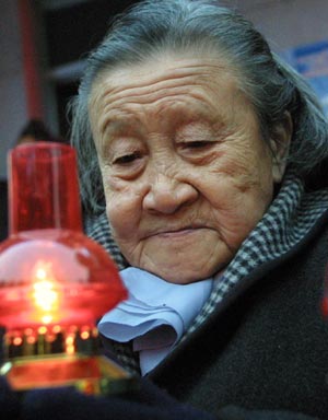 Li Xiuying, survivor of the Nanjing massacre in 1937 in which over 300,000 were killed by Japanese invaders, holds a red candle to commemorate the victims in Nanjing, East China's Jiangsu Province.[newsphoto.com.cn]