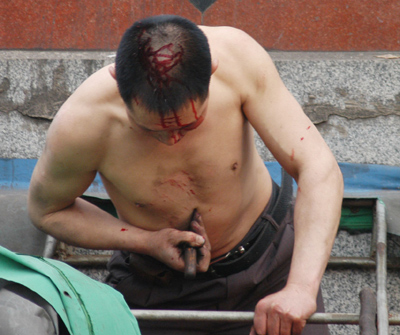 The migrant worker attempts to commit suicide with a shovel. [newsphoto]