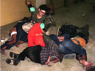 The Washington Post photo shows a US soldier with his right arm and fist cocked appears prepared to strike one detainee in a pile of detainees in the Abu Ghraib detention facility outside Baghdad. [file]