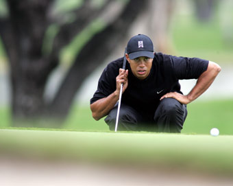 Tiger Woods lines up his putt on the seventh hole on the second hole of the Ford Championship at Doral, at the Doral Golf Resort in Miami, Florida, March 3, 2005. Woods headed into the tournament with the opportunity for the third week running to reclaim the number one world ranking. [Reuters]