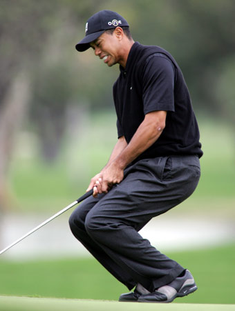 Tiger Woods reacts to missing a putt on the sixth hole of the Ford Championship at Doral, at the Doral Golf Resort in Miami, Florida, March 3, 2005. Woods headed into the tournament with the opportunity for the third week running to reclaim the number one world ranking. [Reuters]