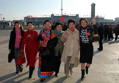 Members walk across the Tian'anmen Square to attend the NPC preparatory meeting. [newsphoto]