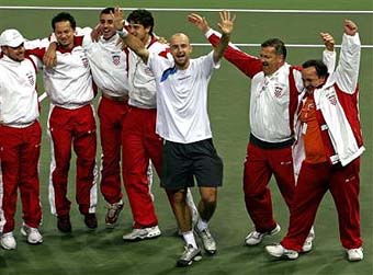 When Ljubicic finished it off with a service winner, the Croatian team locked arms and broke into an impromptu jig on the court. Croatia seemed to have almost as many fans as the U.S. team in the lively, drum-banging and somewhat rowdy crowd of 6,584. Southern California is home to a large number of transplanted Croatians. Croatia moves on to the quarterfinals against Romania, which defeated Belarus in the first round. France 3, Sweden 2 At Strasbourg, France, Paul-Henri Mathieu blew three match points before finally outlasting gritty Thomas Johansson 6-1, 6-4, 6-7 (4), 6-4 of Sweden to clinch the victory for France. Sweden tied the match earlier in the day when Joachim Johansson rallied from a set down to beat Sebastien Grosjean 3-6, 6-1, 6-4, 6-1. France moves on to play Russia in the quarterfinals. Russia 4, Chile 1 At Moscow, Australian Open (news - web sites) champion Marat Safin beat Fernando Gonzalez of Chile 7-6 (4), 7-6 (5), 1-6, 6-7 (3), 6-4 to send Russia into the quarterfinals. Nikolay Davydenko also beat Paul Capdeville 6-2, 6-1. Russia will play France in July. Romania 3, Belarus 2 At Brasov, Romania, Victor Hanescu beat Vladimir Voltchkov 7-6 (2), 6-4, 7-6 (6) to put Romania into the quarterfinals. Earlier in the day, top Romanian player Andrei Pavel defeated Max Mirnyi 6-1, 7-6 (0), 4-6, 6-3. Argentina 5, Czech Republic 0 At Buenos Aires, Argentina, Agustin Calleri and Guillermo Coria easily won to help Argentina sweep the Czech Republic. Calleri defeated Tomas Zib 6-2, 6-4 and Coria beat Jan Hernych 6-3, 6-0. Argentina will face Australia in Sydney in the quarterfinals July 15-17. Australia 5, Austria 0 At Sydney, Australia, Todd Woodbridge and Chris Guccione both won singles matches to complete a sweep for the home team. Netherlands 3, Switzerland 2 At Fribourg, Switzerland, Sjeng Schalken defeated Stanislas Wawrinka 1-6, 6-2, 6-4, 2-6, 9-7 to move the Netherlands into the quarterfinals. In the second singles match, Peter Wessels led Marco Chiudinelli 6-4 but withdrew with a back injury. The Dutch will meet Slovakia in the next round. Slovakia 4, Spain 1 At Bratislava, Slovakia, Fernando Verdasco beat Kamil Capkovic 6-2, 6-2 to earn a point for defending champion Spain, which was eliminated the day before by Slovakia. In the other singles match, Slovakia's Michal Mertinak beat Feliciano Lopez 6-0, 6-7 (3), 6-4. Slovakia will face the Netherlands in the quarterfinals.