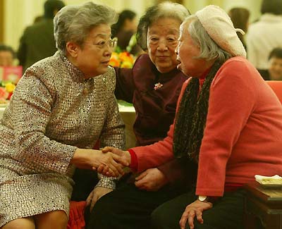 Vice-Premier Wu Yi (left) in close discussion with Huang Ganying (right), 85, and Zhang Jiexun, 83, at a ceremony to mark today's International Women's Day in the Great Hall of the People in Beijing yesterday. Both Huang and Zhang are former vice-chairwomen of the All-China Women's Federation. [China Daily]