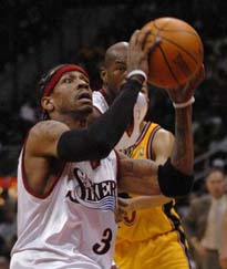Philadelphia 76ers guard Allen Iverson looks to shoot against the Atlanta Hawks during the third quarter Saturday, March 5, 2005, in Atlanta. Iverson had 33 points in the 76ers' 98-97 win. [AP]
