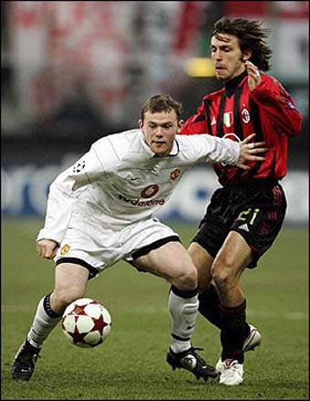 Manchester United's forward Wayne Rooney (L) tries to keep AC Milan's midfielder Andrea Pirlo, during their Champions League 2nd leg football match at San Siro stadium in Milan. AC Milan won the match 1-0.[AFP]
