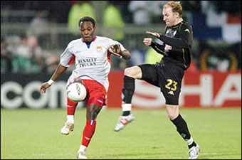 vies for the ball with Bremen Finnish defender Petri Pasanen(L) during