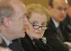 Former United States Secretary of State Madeleine Albright listens to France's former Foreign Minister Hubert Vedrine, left, speaking on the future of trans-Atlantic relations during a work meeting of the International Summit on Democracy, Terrorism and Security Wednesday, March 9 2005, in Madrid, Spain. [Reuters]