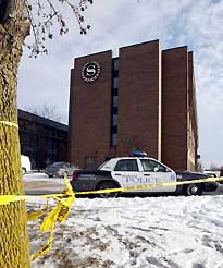 Brookfield, Wisconsin police secure the scene outside a Sheraton Hotel in Brookfield hours after a New Berlin man opened fire killing eight people, including himself, and wounding five others March 12, 2005. The victims were attending a Church of the Living God service when the shooting took place. [AP]
