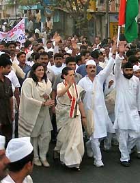 Congress party President Sonia Gandhi, center, participates in the Dandi Yatra, a re-enactment of the historic march undertaken by mahatma Gandhi in 1930, in Ahmadabad, India, Saturday, March 12, 2005. [Reuters]