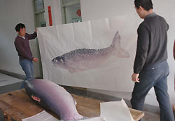 Farmers in Northwest China's Shaanxi Province completed an art work with a huge fish measuring 1.80-meter-long, Mar. 6, 2005. This work, according to its painter, is made for the 2008 Olympic Games. [newsphoto]
