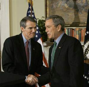 US President Bush announces Ohio Congressman Rob Portman, a Republican, as his choice to become the new U.S. trade representative, in the Roosevelt Room of the White House in Washington, Thursday, March 17, 2005. Portman will replace Robert Zoellick who has moved to a senior post at the State Department. [AP Photo]