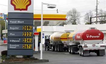 David Garcia, of Seattle, a tanker truck driver for Shell Oil, gets out of his truck Thursday, March 17, 2005 as he prepares to deliver gasoline to this Shell station near downtown, Tacoma, Wash. According to the AAA, the national average Thursday was $2.06 a gallon, and oil prices briefly climbed above $57 a barrel. [AP]