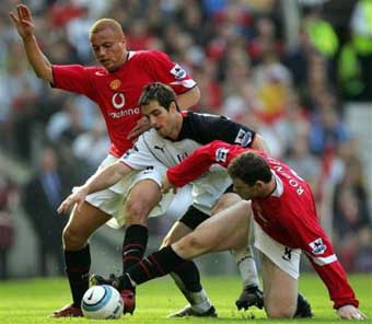 Manchester United's Wes Brown, left, and teammate Wayne Rooney, right, challenge Fulham's Carlos Bocanegra during their English Premiership League soccer match at Old Trafford, Manchester, England, Saturday March 19, 2005. Manchester United won the match 1-0. [AP]
