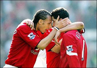 Congratulating Ronaldo : Manchester United's Rio Ferdinand (L) celebrates with Cristiano Ronaldo (R) during today's English Premiership football match against Fulham at Old Trafford, Manchester. Manchester won 1-0. [AFP]