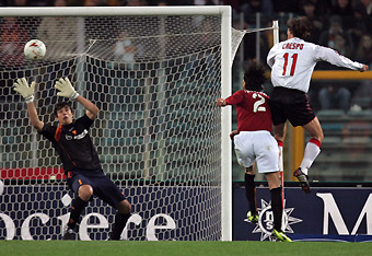 over the head of AS Roma's defender Christian Panucci and past keeper