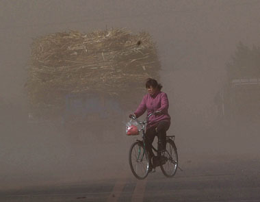 A woman rides a bicycle in a sandstorm in Baotou, a city in north China's Inner Mongolia Autonomous Region March 23, 2005. The sandstorm, first this year, reduced visibility to a very low level and caused much trouble to local residents. In spring, northern China regions, including Inner Mongolia and Beijing, are vulnerable to sandstorms due to scarcity of rainfalls and desertification. [newsphoto]