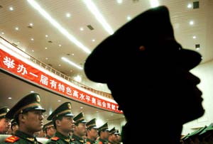 Chinese security personnel listen to a speech on security issues affecting the 2008 Olympics, in Beijing, March 23, 2005. The construction of the 2008 Olympic venues is in progress as the National Olympic Stadium, dubbed the "birds nest" because of its unusual design, will begin construction this week. [Reuters]
