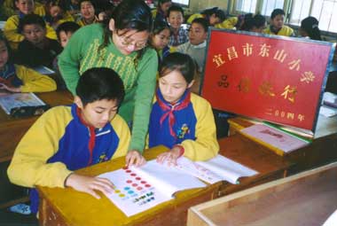 Students and teachers with Dongshan Primary School in Yichang, Hubei Province, apply a new system to encourage students to help others. This photo was taken on November 9, 2004. [newsphoto]
