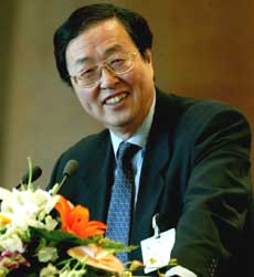 Zhou Xiaochuan, governor of the People's Bank of China or the central bank, speaks at the China Development Forum on March 21, 2005 in Beijing. Zhou indicated that China will not follow the US in making frequent rate adjustments. [newsphoto]