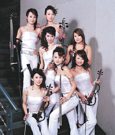 Few have caught enough attention to be considered a true sensation within China's cities, apart from the The 12 Girls' Band, seven-member Classical & Trendy plans to change that. The name is bit of a parody itself, but the group can generally be described as fashionably classical. Comprised of five violinists and two flautists, the group aims to present classic music with a modern flavour. Central to the septet's appeal are dance beats and, well, sex appeal. Appearing in publicity shots wearing skin-baring outfits, and strategically-placed instruments, their sales strategy is reminiscent of that employed by the Australian-British string quartet Bond. Just as unconventional is the group's music, which weaves synthesisers, vocal samples and world music flavours with classical melodies. It's a purist's nightmare, but a dream come true for the twenty-something women to play instrumental music that is frenetic, emotional and simple. Their music ranges from off-beat Chinese folk song "Jasmine" to Celin Dion's "My Heart Will Go On." Unlike Bond's creation by it four members, it was actually four veteran men musicians behind Classical & Trendy. Early last year, Zhang Hongguang, one of China's most famous composers, happened to see a violinist playing while dancing. "I thought it was a great way to present classical music," Zhang said. "Then I thought, if we could find two or more violinists like her, we could set up a group, that would be huge." He shared his idea with violinist Li Peng, Manager of the Beijing Symphony Orchestra, who showed immediate interest. Later, Huang Lijie, co-founder and chief conductor of the Asia Philharmonic Orchestra (APO), and violinist Qin Lang, also from the APO, joined the efforts. They set up the septet in May, 2004. "I have been with the Beijing Symphony Orchestra for decades," said Li, now the agent of the septet. "I love classical music. But I don't think we are doing it well. People are reluctant to come to the theatre for our performances. I believe it is because of their fast-paced lifestyles. The orchestra is too classical to fit into their life. "And there is the success of Bond. But we can have our own Bond." Besides regular musical rehearsals, the septet also receive training on style and choreography. "Nowadays the way you present the music is becoming increasingly important," Zhang said. Over the past year, the septet has toured around the country, playing everywhere from the opening ceremony of Shanghai's Formula 1 to CCTV's Spring Festival Gala. They are currently preparing for the release of their debut CD. The women of the septet, all classically trained, decline to categorize their sound, noting the influences of rock, hip-hop and dance music. They hope they can help make classical music "coola" again. Flautist Zhao Xiaoxiao, a graduate from the Central Academy of Music said: