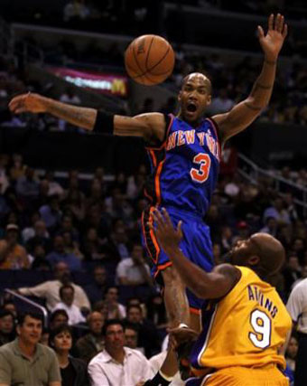 New York Knicks' Stephon Marbury, left, loses control of the ball against Los Angeles Lakers' Chucky Atkins during the first quarter of their game Tuesday, March 29, 2005, at the Staples Center in Los Angeles. [AP]