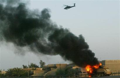 A U.S. helicopter flies over the scene of an attack against an M-1064 armoured personel carrier, burning in the background, in West Baghdad, Iraq, Friday, April 1st, 2005. Two were injured in the attack. [AP]