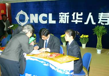 Staffs of New China Life Ningbo Branch help an elder woman buy insurance policy in this November 2003 file photo. The life insurer is planning an overseas IPO to raise US$800 million. [newsphoto]
