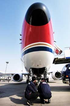 Two technicians check a B737-800 passenger jet in Taiyuan, Shanxi Province April 3, 2005 before a regular flight. Boeing's Beijing office said that Outdated insulation blankets in some Boeing airplanes used in China pose no safety problems. [newsphoto]