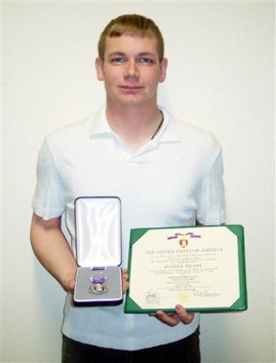 Stout, of Utica, Ohio, was awarded the Purple Heart after a grenade sent pieces of shrapnel into his arm, face and legs while he was operating a machine gun on an armored Humvee last May.