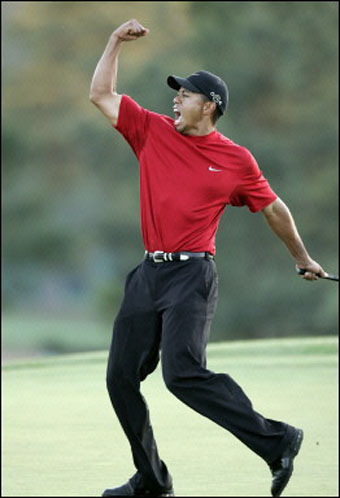 Woods sank a 15-foot birdie putt on the first sudden death playoff hole to