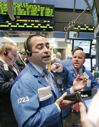 Specialist Daniel O'Donnell, right, conducts trades in General Motors on the floor of the New York Stock Exchange Friday morning April 15, 2005. Wall Street extended its selloff Friday after industrial production figures pointed to a slowing economy and higher prices on imports fed investors' inflation worries. [AP]