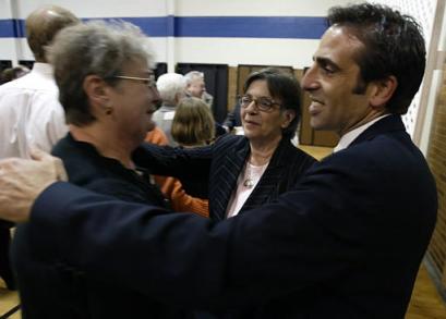 Mary Schindler, center, mother of Terri Schiavo, and son Bobby Schindler, right, greet a family friend following a memorial Mass for Schiavo at Our Lady of Good Counsel church in Southampton Pa., Friday, April 15, 2005. Schiavo died March 31 at a hospice in Pinellas Park, Fla., 13 days after her feeding tube was removed by court order--ending a bitter legal battle between her husband, Michael, and her parents, Bob and Mary Schindler. [AP]